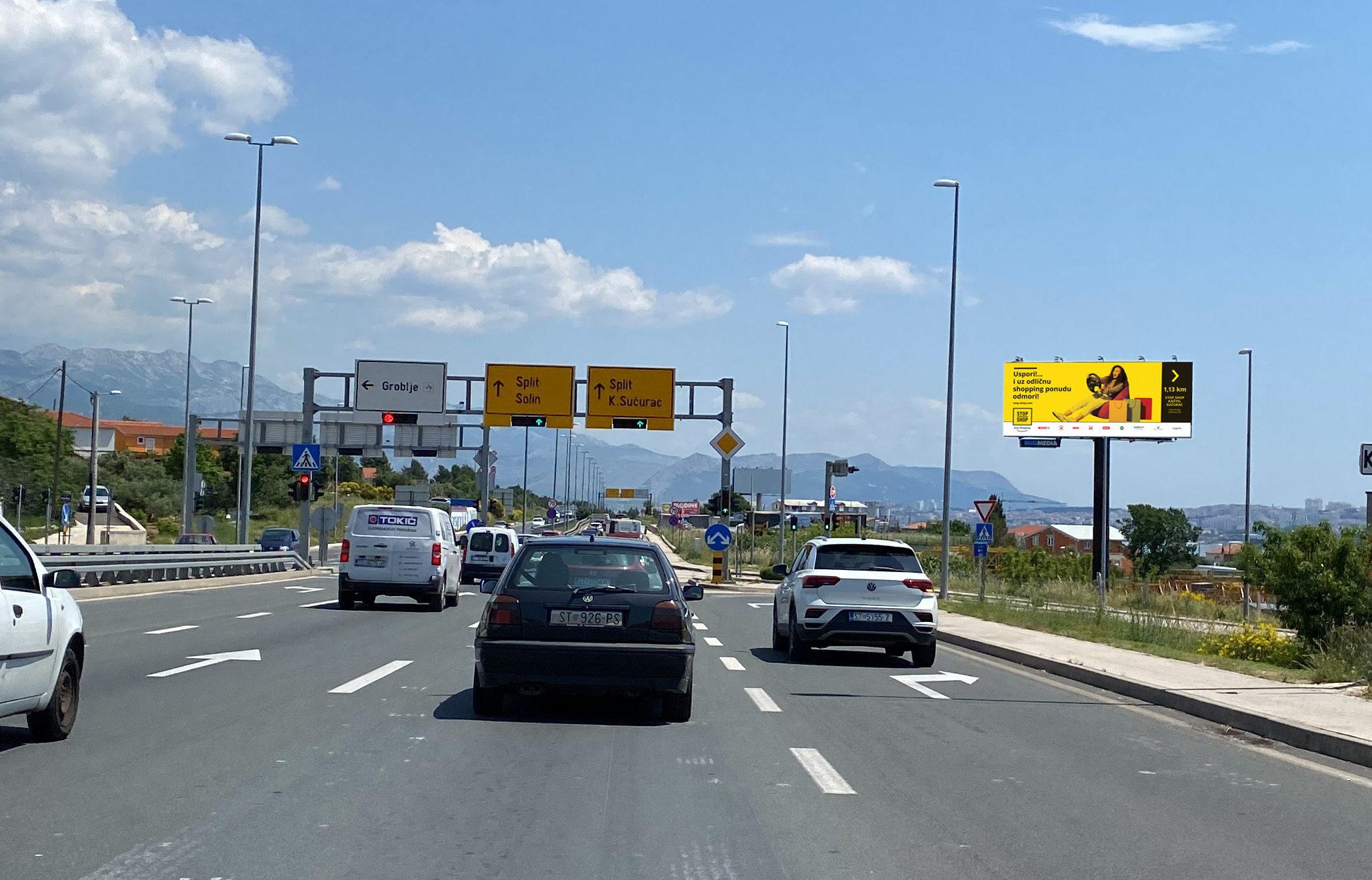 Dvostrani osvijetljeni pano, veličine oglasne površine 12x5m; Kaštel Gomilica, A strana vidljiva je u smjeru Splita, a B strana je vidljiva u smjeru prema Trogiru.